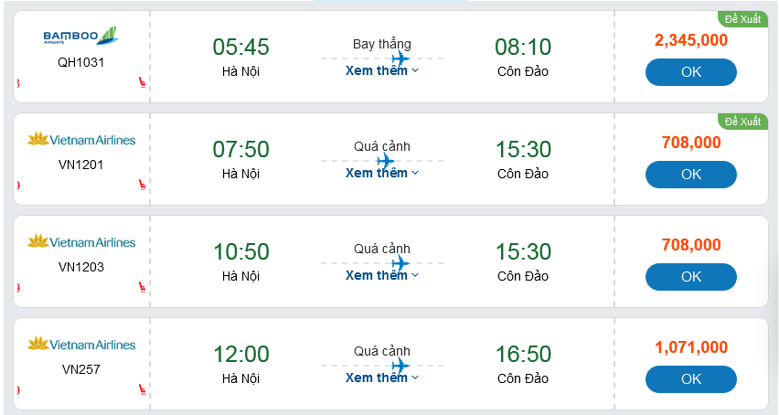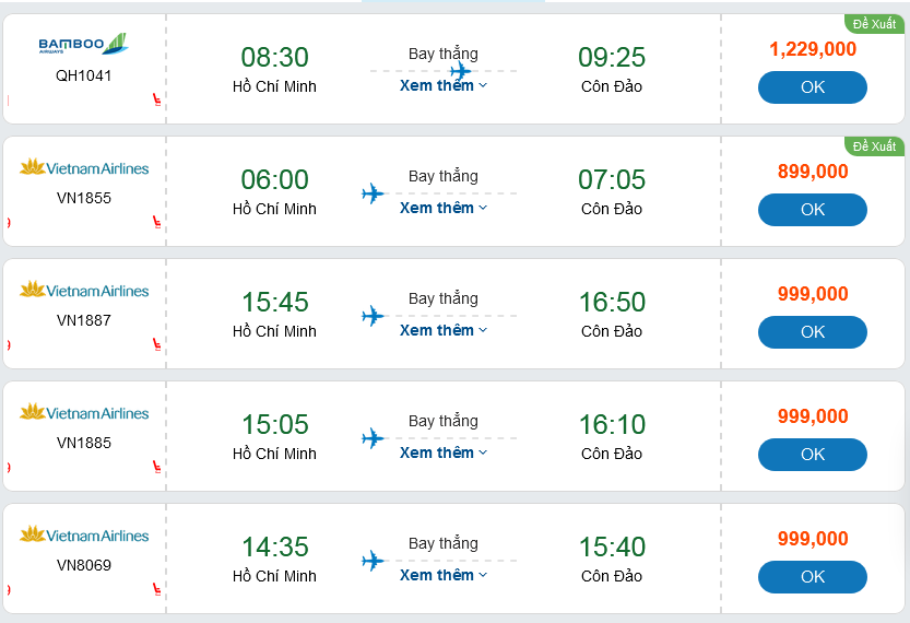 Đường bay thành phố Hồ Chí Minh đi Côn Đảo cũng đang được 2 hãng hàng không Nội địa là Vietnam Airlines và Bamboo Airways khai thác với tần suất khá cao. Trong đó, Vietnam Airlines mở bán vé máy bay Sài Gòn đi Côn Đảo với giá khá mềm, chỉ từ 899.000 đồng. Bamboo Airways áp dụng giá vé từ 1.229.000 đồng. Bạn có thể tham khảo như sau:
