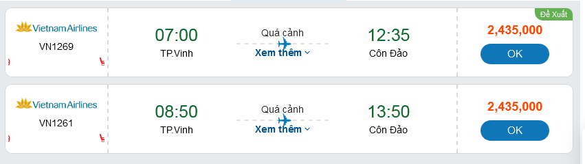 Hãng hàng không quốc gia Vietnam Airlines cũng đang khai thác đường bay thẳng Vinh đi Côn Đảo. Tuy nhiên, tần suất cho chặng bay này còn khá thấp, ngay cả khi bay vào các ngày thứ 2,4,6 và chủ nhật cũng không phải lúc nào cũng có vé. Do đó, bạn cần lên kế hoạch đặt vé sớm để tránh tình trạng hết vé sát ngày bay. Giá vé Vinh đi Côn Đảo đang ở mức 2.435.000 đồng.