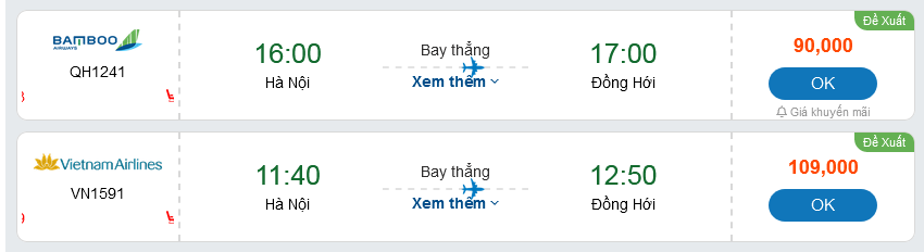 Đường bay Hà Nội – Đồng Hới hiện được 2 hãng hàng không là Vietnam Airlines và Bamboo Airways cùng khai thác. Trong đó, hãng hàng không Bamboo Airways mở bán vé với mức giá từ 90k, Vietnam Airlines áp dụng giá vé máy bay Hà Nội đi Đồng Hới từ 109k.