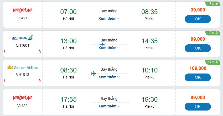 Hiện tại, cả 4 hãng hàng không nội địa Vietnam Airlines, VietJet Air, Pacific Airlines và Bamboo Airways đều chú trọng khai thác đường bay Hà Nội đi Pleiku và ngược lại. Hành trình bay kéo dài trong khoảng 01h10p. Hãng hàng không giá rẻ Vietjet Air hiện nay đang đưa ra mức giá vé máy bay Hà Nội đi Pleiku tháng 5 rẻ nhất chỉ từ 39k. Bamboo Airways cũng mở bán vé với giá cực thấp, 99k. Chi tiết như sau: