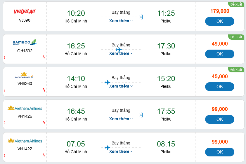 Hành trình bày từ Sài Gòn đi Pleiku cũng đang được các hãng hàng không tích cực khai thác, đã đáp ứng nhu cầu đi lại của du khách. Giá vé máy bay cho hành trình này thấp nhất từ 45k-179k. Đây được xem là mức giá hấp dẫn trong thời điểm này, do đó, bạn hãy lên kế hoạch đặt vé càng sớm càng tốt nhé.