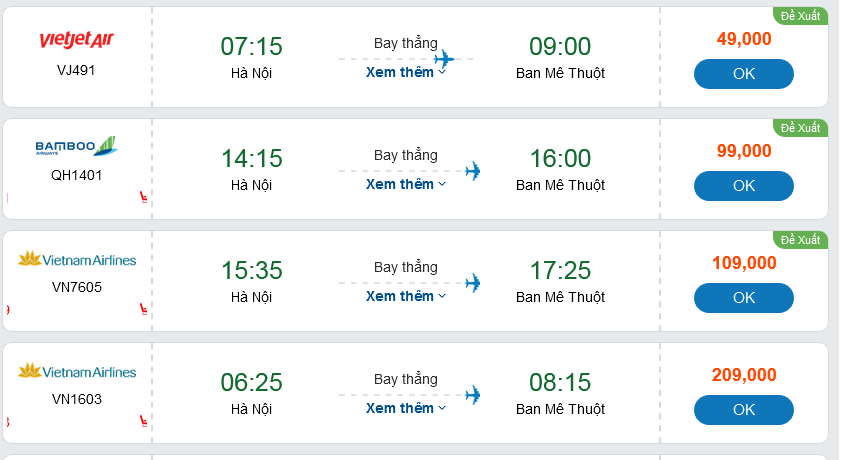 Hiện có 4 hãng hàng không nội địa khai thác đường bay thẳng từ Hà Nội đến Buôn Mê Thuột. Chuyến bay của các hãng có sự phong phú về khung thời gian bay lẫn mức giá để bạn có thể lựa chọn phù hợp với kế hoạch của mình. Mức giá vé máy bay cho hành trình này hiện dao động từ 49.000 đồng – 209.000 đồng. Trong đó, Vietjet Air đang là hãng hàng không mở bán giá vé thấp nhất chỉ từ 49.000 đồng. Bạn có thể tham khảo chi tiết như sau: