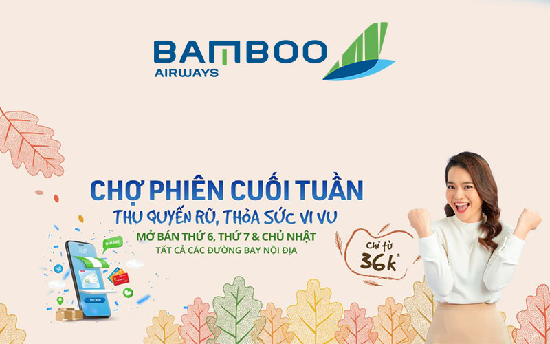 Chương trình chợ phiên cuối tuần được Bamboo Airways tung vé rẻ đối với tất cả các đường bay nội địa mà hãng đang khai thác, bạn có thể thỏa sức tìm kiếm những hành trình tuyệt nhất. Một số chặng bay hot chỉ từ 36.000 đồng mà bạn có thể tham khảo như Hà Nội – TP. Hồ Chí Minh, Hà Nội – Đà Nẵng, Hải Phòng – Đà Nẵng, TP. Hồ Chí Minh – Thanh Hoá, TP. Hồ Chí Minh – Đà Nẵng, Đà Nẵng – Nha Trang: 36k…