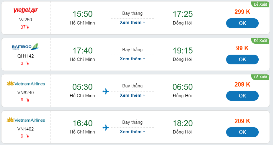 Đối với chặng bay TPHCM đi Quảng Bình, hiện tại cả 3 hãng hàng không nội địa Vietnam Airlines, bamboo Airways và Vietjet Air đều đang tích cực khai thác. Nhiều khung giờ bay ban ngày với mức giá tố để bạn lựa chọn. Cụ thể, Bamboo Airways đang áp dụng giá vé từ 99.000 đồng. Vietnam Airlines mở bán vé TPHCM – Quảng Bình với giá từ 209.000 đồng và Vietjet Air từ 299.000 đồng. Bạn có thể tham khảo chi tiết như sau: