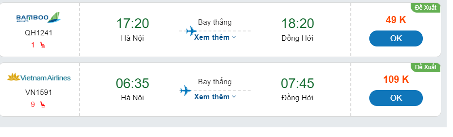 Đường bay Hà Nội đi Quảng Bình đang được Vietnam Airlines và Bamboo Airways khai thác. Giá vé dao động từ 49.000 đồng – 109.000 đồng. Đây được xem là mức giá cực kì rẻ để bạn thực hiện một chuyến bay đến mảnh đất miền Trung tuyệt vời này. tất nhiên, giá vé rẻ thường có hạn, do đó bạn cần lên kế hoạch săn vé sớm nhé!
