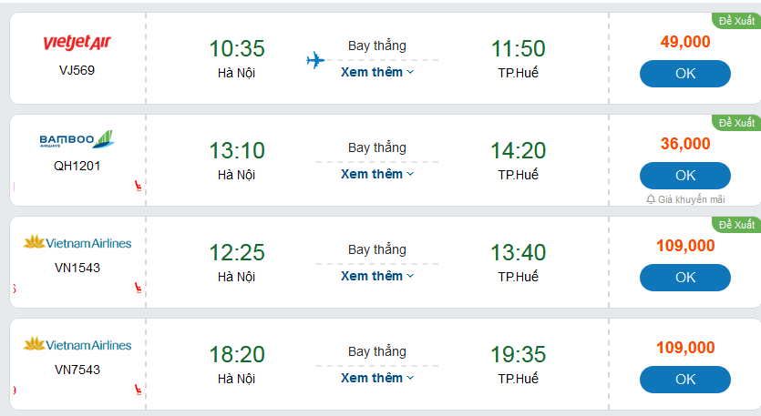 Hành trình bay Hà Nội đến Huế hiện đang được cả 3 tháng khác không nội địa khai thác là Vietnam Airlines, VietJet Air và Bamboo Airways với nhiều khung giờ bay khác nhau để bạn lựa chọn. Bamboo Airways là hãng hàng không áp dụng giá rẻ nhất cho đường bay này chỉ từ 36k. VietjetAir cũng không hề kém cạnh khi mở bán vé Hà Nội đi Huế với giá 49k. Hãng hàng không quốc gia Vietnam Airlines với nhiều dịch vụ tiện ích và phong cách làm việc chuyên nghiệp khai thác đường bay Hà Nội – Huế chỉ từ 109k. Bạn nên nhanh chóng đặt vé sớm bởi số lượng về giá rẻ sẽ hết nhanh chóng.