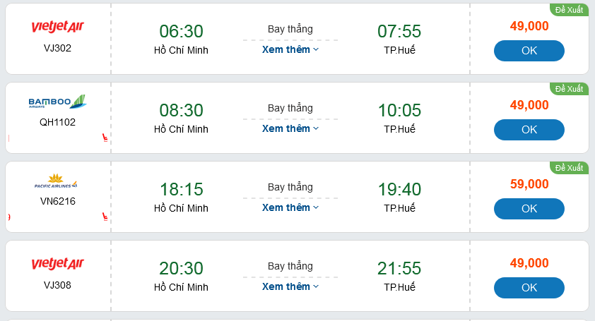 Tháng 3 này, các hãng hàng không cũng đang tích cực khai thác hành trình bày TP Hồ Chí Minh đến Huế với tần suất cao, đáp ứng nhu cầu đi lại của du khách. Giá vé máy bay cho đường bay này dao động từ 49k – 209k. Bạn có thể tham khảo chi tiết bảng giá vé máy bay TP Hồ Chí Minh đi Huế như sau: