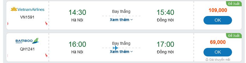 Giá vé máy bay Hà Nội đi Quảng Bình