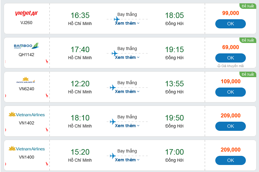 Giá vé máy bay TP Hồ Chí Minh đi Quảng Bình
