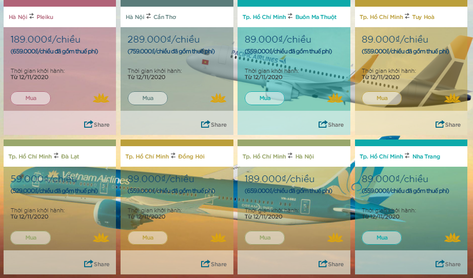 Hãng hàng không Vietnam Airlines đã chính thức mở bán vé máy bay khuyến mãi Thứ 5 rực rỡ từ 0h00 phút đến hết ngày thứ 5 (12/11/2020). Mức giá chỉ từ 59.000 đồng, áp dụng cho nhiều hành trình bay nội địa. Bạn có thể liên hệ đặt vé tại các đại lý hoặc trên website, ứng dụng di động của hãng Vietnam Airlines, Một số hành trình giá tốt mà bạn có thể tham khảo như sau: