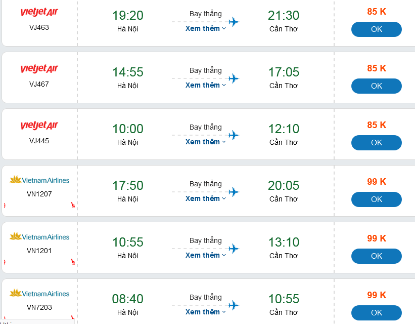 Hiện tại, VietJet Air và Vietnam Airlines khai thác chặng bay thẳng Hà Nội – Cần Thơ hàng ngày với rất nhiều khung giờ bay trong ngày đáp ứng mọi nhu cầu đi lại của hành khách trong thời gian có điểm này. Hãng hàng không Vietjet Air đang mở bán vé máy bay đi Cần Thơ từ Hà Nội cực tốt, thấp nhất chỉ từ 85.000 đồng/ chiều trong hầu hết các ngày bay tháng 3 này. Tùy theo lịch trình cá nhân mà bạn có thể chọn tấm vé phù hợp nhất.