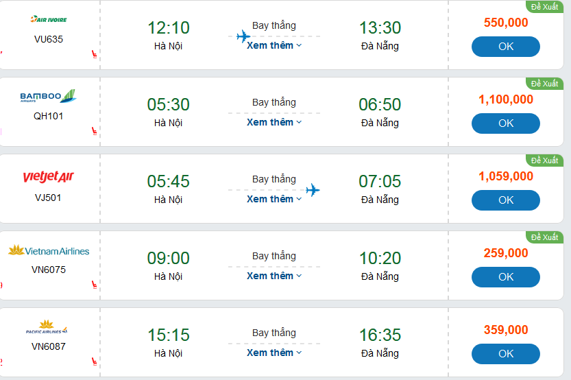 Hành trình bay Hà Nội đi Đà Nẵng hiện nay đang được cả 5 hãng hàng không nội địa là Vietnam Airlines, Vietjet Air, Bamboo Airways, Pacific Airlines và hãng hàng không mới Vietravel Airlines khai thác. Đây là một trong những đường bay chính phục vụ nhu cầu đi lại của người dân. Do đó, các hãng đều khai thác với nhiều khung giờ bay để hành khách có thể lựa chọn. Giá vé máy bay cho hành trình này dao động từ 99k – 309k. Tuy nhiên, nếu đặt vé vào sát ngày lễ 30/4-1/5, mức giá có thể để tăng cao hơn, thậm chí gặp đôi, gấp ba lần ngày thường.
