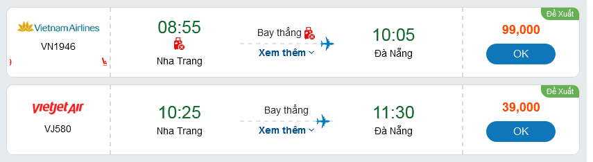 Hành khách tại Nha Trang mong muốn ghé thăm Đà Nẵng cũng có thể lên kế hoạch đặt vé sớm. Hành trình bay Nha Trang đi Đà Nẵng hiện đang được hãng hàng không Vietnam Airlines và Vietjet Air khai thác với tần suất chỉ từ 1-2 chuyến/ngày. Với số lượng chuyến bay còn hạn chế như vậy, bạn nên đặt vé ngay hôm nay để tránh tình trạng hết vé vào sát ngày bay. Hiện tại, Vietjet Air đang mở bán vé máy bay Nha Trang đi Đà Nẵng với giá từ 39k, Vietnam Airlines áp dụng mức giá từ 99k.